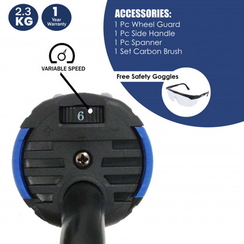 - اقلام همراه: ۱ عدد محافظ صفحه سنگ، ۱ عدد دسته کمکی، ۱ عدد آچار، ۱ عدد برس کربنی، دوشاخه BS با کابل ۲ متری