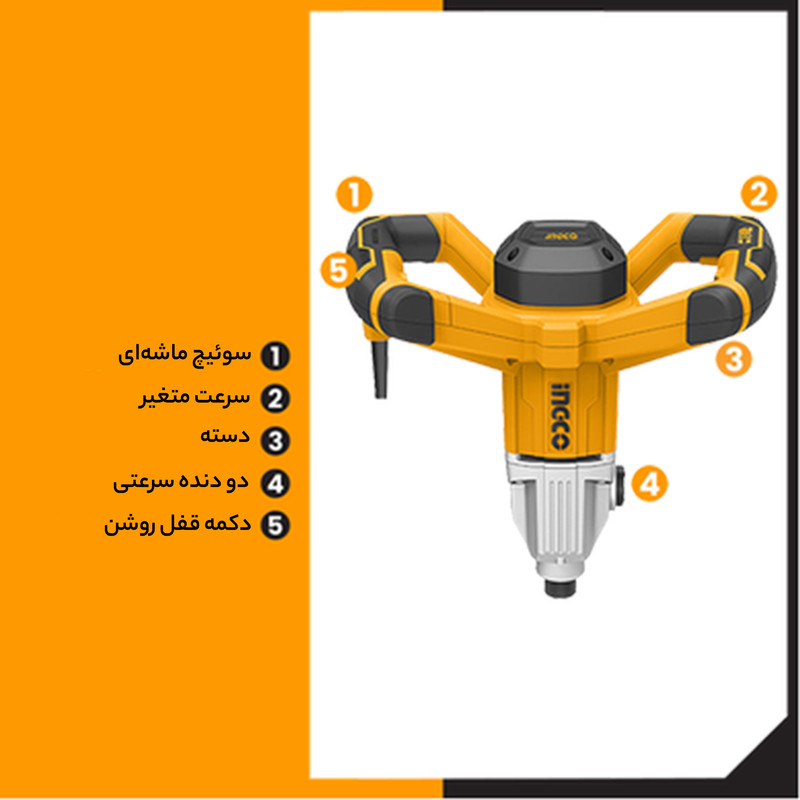 دریل میکسر 1400 وات اینکو مدل MX214008، یک دریل همزن با موتور قدرتمند دارای گیربکس دو سرعته جهت همزدن و یکنواخت کردن متریال هایی همچون رنگ، دوغاب، ملات سیمان و … استفاده می شود، همچنین برای ترکیب موادی که خاصیت خمیری شکل دارند کاربرد دارد.