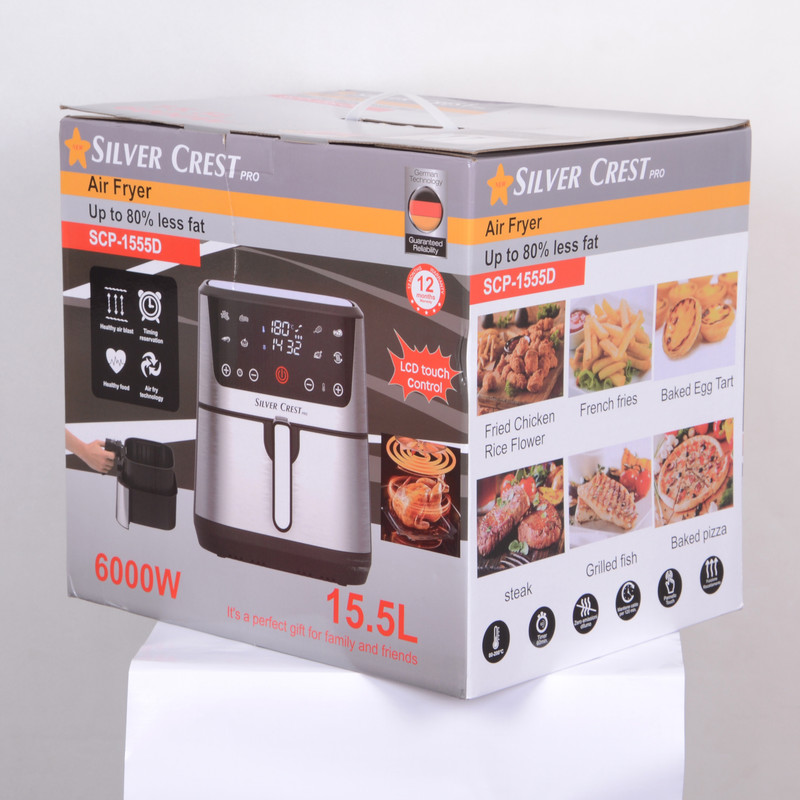 سرخ‌کن بدون روغن Silver Crest Pro SCP-1555D ترکیب قدرت و ظرفیت بالا برای آماده‌سازی سریع و سالم‌تر غذاست. با ظرفیت بزرگ 15.5 لیتر مناسب خانواده‌ها و مهمانی‌ها، و توان بالای 6000 وات برای رسیدن سریع به دما و پخت یکنواخت. صفحه نمایش دیجیتال لمسی (LCD) و دکمه‌های لمسی استفاده را ساده می‌کند و برنامه‌های از پیش‌تنظیم به شما امکان پخت انواع غذاها را با کمترین زحمت می‌دهد. فناوری گردش هوای داغ (Air Fry) تا تا 80% کاهش چربی را نوید می‌دهد. سبد قابل جداشدن و سطح داخلی قابل شستشو کار نظافت را آسان می‌کند.