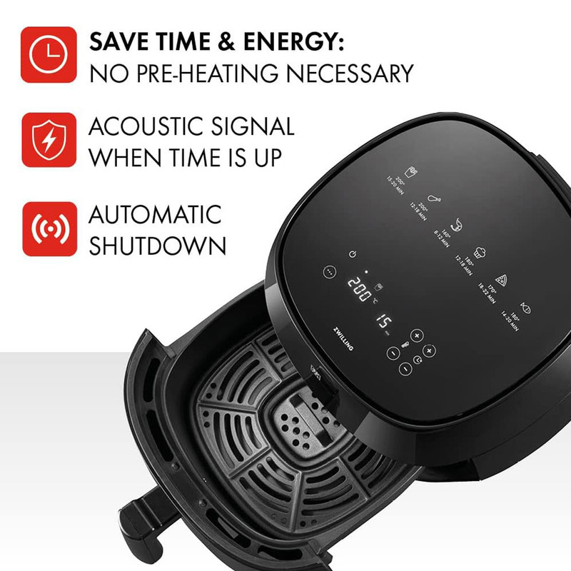 در صفحه نمایش لمسی LED، می توانید شش برنامه از پیش تعیین شده برای سیب زمینی سرخ کرده، مرغ، میگو، ماهی، پیتزا و کیک را انتخاب کنید . با این حال، دما و زمان را نیز می توان به صورت جداگانه تنظیم کرده تا کنترل بهتری برای پخت غذا داشته باشید . یک کتاب دستور پخت در داخل جعبه موجود می باشد تا شما بهترین ایده ها برای آشپزی را داشته باشید.