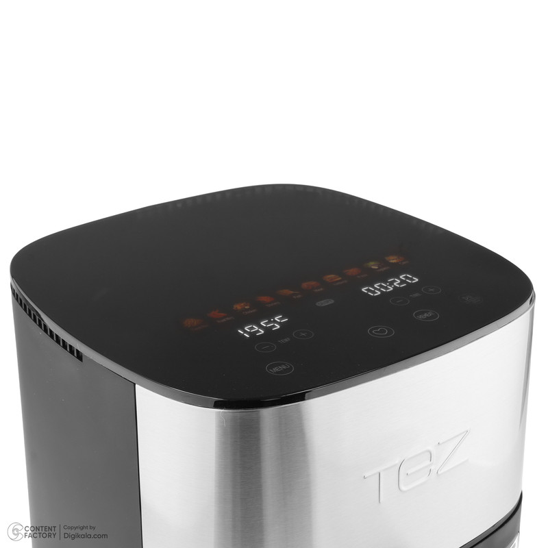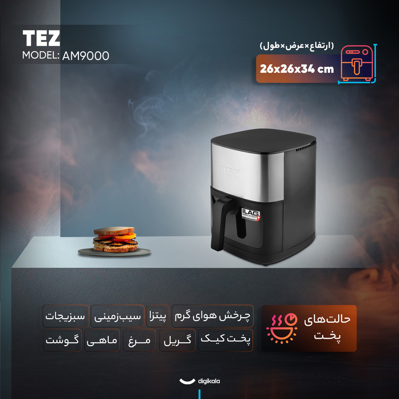 سرخ کن بدون روغن تز مدل AM9000 یک دستگاه چندمنظوره و پیشرفته برای پخت سالم غذا است که از تکنولوژی گردش هوای داغ برای سرخ کردن و پخت بدون نیاز به روغن استفاده میکند. این مدل دارای ظرفیت ۶.۵ لیتر بوده که برای تهیه غذا برای ۸ نفر مناسب است. با ۱۰ برنامه پخت از پیش تنظیمشده، امکان سرخ کردن، گریل، یخزدایی و حتی خشک کردن میوه را دارد. تابه نچسب از جنس تفلون، نظافت دستگاه را آسان کرده و نمایشگر دیجیتال و چراغ داخلی، کنترل فرآیند پخت را راحتتر میکند. این دستگاه دارای قابلیت تنظیم دما از ۴۰ تا ۲۰۰ درجه سانتیگراد بوده و با توان ۲۰۰۰ وات و فن کانوکشن، پخت یکنواخت و سریع را تضمین میکند. سیستم خاموشی خودکار نیز ایمنی دستگاه را افزایش داده و از سوختن غذا جلوگیری میکند. سرخ کن بدون روغن تز مدل AM9000، گزینهای ایدهآل برای افرادی است که به دنبال پخت غذاهای سالم، کمچرب و در عین حال خوشطعم هستند.