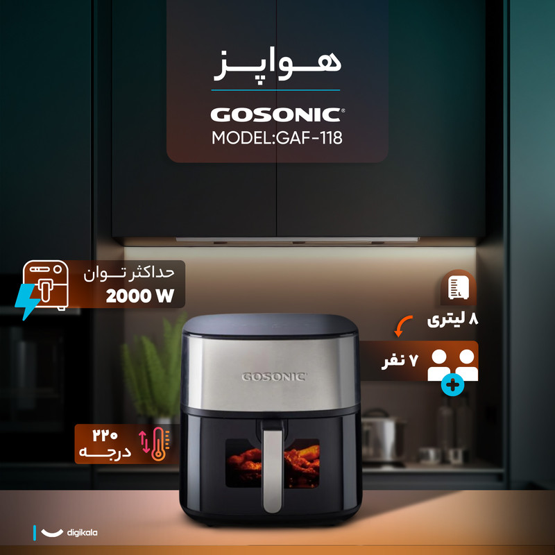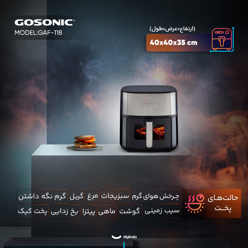 سرخ کن گوسونیک مدل GAF-118 یک سرخ کن بدون روغن و با هوای گرم میباشد که مواد غذایی را تا 80 درصد چربی کمتر آماده میکند و سلامت شما را تضمین می کند.
