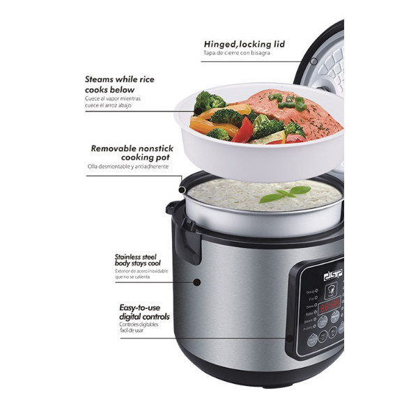 پلوپز دی اس پی مدل KB5004 از سری محصولات برند جهانی دی اس پی است. ظرفیت این پلوپز 5 لیتر است و میتواند برای یک خانواده یا گروه پرجمعیت هم مورداستفاده قرار گیرد. این محصول تنها یک پلوپز نیست؛ بلکه قابلیتهای زیادی دارد. عملکرد پخت برنج، تهیهی تهدیگ، حلیم، سوپ، بخارپزکردن، فرنی، ماستبندی، آرامپزکردن و تهیهی ماکارونی و پاستا، تعدادی از قابلیتهای این دستگاه است. قابلیت گرمکردن مجدد برنج بسیار کارآمد است و پلوی سرد را مانند پلوی تازه پختهشده، آمادهی صرف میکند. نمایشگر باکیفیت دیجیتال و درشت این محصول، امکان بهرهمندی از امکانات آن را راحتتر میکند. در دستگاه با یک دکمه باز میشود و ظرف اصلی داخل آن قرار میگیرد. فیلتر روی در به طریقی متصل شده که بهراحتی میتوان آن را خارج کرد تا در دستگاه از سمت داخل تمیز باشد. روکش ظرف، تفلون و درجهبندیشده است. بدنهی دستگاه همواره خنک است و خطری ایجاد نمیکند. روی بدنه یک دستگیره هم وجود دارد که برای حمل مصرف میشود.