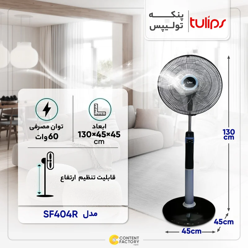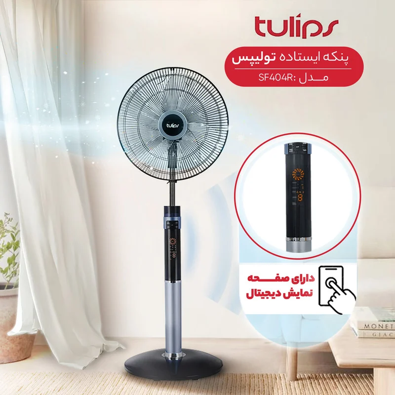 امروزه پنکه‌های ایستاده از اقبال بالایی در بین خریداران برخوردار هستند و اگر با قابلیت تنظیم ارتفاع هم همراه باشند، به علت عدم اشغال فضا گزینه‌ی اول اغلب مردم به حساب می‌آیند. پنکه ایستاده تولیپس مدل SF404R از جمله همین گزینه‌های ایستاده است که در زمان کار از ثبات کافی و عدم لرزش خوبی بهره برده است. این محصول خنک‌کننده امکان گردش افقی و عمودی دارد و با وجود قابلیت تنظیم درجه عمودی وزش باد و گردش افقی دستگاه به منظور بهره‌مندی از بهینه‌ترین عملکرد، گزینه‌ای کاربردی به شمار می‌رود. ابعاد این کالا 45x45x130 سانتی‌متر و وزن آن 6 کیلوگرم است از این روی برای محیط‌هایی با ابعاد زیر 30 متر مربع کارا است. پنکه ایستاده تولیپس مدل SF404R با داشتن پنل دیجیتال، کنترل از راه دور و تغییر سرعت (در سه حالت کم، متوسط و زیاد) نیاز کاربر را به خوبی رفع می‌کند و گزینه‌ای با قیمت خرید مناسب و ارزش خرید بالا به شمار می‌رود.