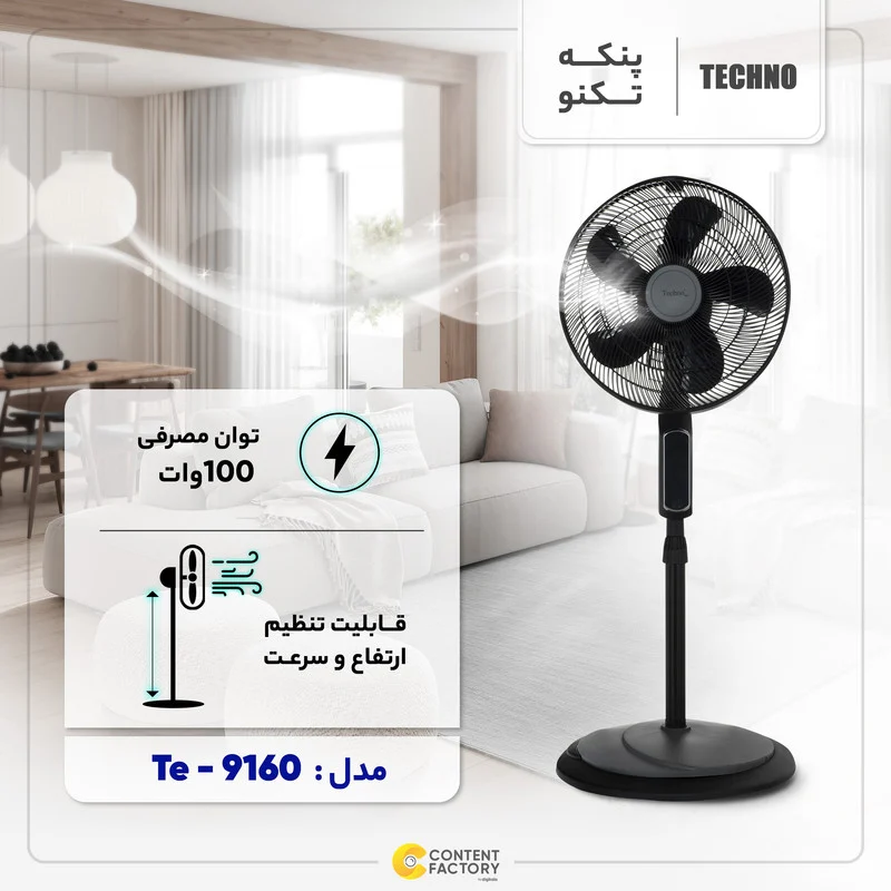 در فصول گرم سال نیاز به خنک کردن و ایجاد گردش هوا در فضاهای بسته از اهمیت بالایی برخوردار میشود. یکی از وسیلههای کاربردی و مورد نیاز در هر خانه و ادارات پنکهها هستند. شرکت تکنو از تولیدکنندگان مطرح پنکه در بازار است. یکی از محصولات کاربردی و باکیفیت این برند مدل Te-9160 است. این مدل با قابلیت استفاده به صورت دیواری، رومیزی و ایستاده میتواند برای هر خانه، فروشگاه و حتی دفاتر کار گزینهای ایدهال باشد. Te-9160 امکان تنظیم ارتفاع را برای شما فراهم کرده و با توجه به قابلیت چرخش افقی سری در هنگام دمیدن باد، تقریبا تمام محیط اتاق را پوشش خواهد داد. این محصول با سری پنج پره از جنس پلاستیک قابلیت تنظیم باد در سه سرعت مختلف را دارد. همچنین وجود ریموت کنترل برای این مدل استفاده از آن را برای کاربران آسانتر میکند.