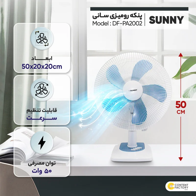 امروزه پنکههای سنتی همچنان در بین خانوادههای ایرانی محبوب هستند و میتوان کمتر کسی را پیدا کرد که یکی از این وسیلههای پرکاربرد را در خانهی خود نداشته باشد. پنکه سانی مدل DF-PA2002 هم از این نوع کالاهای سرمایشی اما در ظاهری جدید است که با وجود موتوری پرقدرت و 5 پرهی پلاستیکی در ساختار خود گردش هوای ایدئالی را در محیط به وجود آورد. این نوع پنکهی رومیزی وزنی به اندازهی 4 کیلوگرم و ابعادی به اندازهی 20x20x50 سانتیمتر دارد اما گردن آن قابلیت تنظیم ارتفاع ندارد. همچنین این مدل پنکهی سانی دارای ریموت کنترل نیست اما میتوان سرعت آن را در سه حالت کم، متوسط و تند کنترل کرد. البته لازم است بدانید که در حالت تند میزان صدای پنکه بالاتر از حالت عادی آن میرود به همین علت هم این محصول گزینهای مناسب برای استفاده در اتاق خوابها نیست.