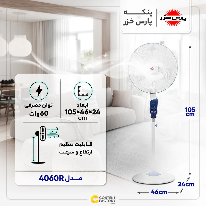 پنکه پارس خزر مدل 4060R از محصولات شرکت پارسخزر است که با طراحی زیبا و یک ریموت کنترل تولید و عرضه شده است.4060r pars قابلیت تنظیم تایمر برای بازههای زمانی متنوع را دارد که یکی از مشخصات کاربردی و قابلتوجه پنکهها به شمار میرود. علاوه بر این، قابلیت گردش افقی به کارایی و عملکرد این محصول میافزاید. پنکه پارس خزر مدل 4010r دارای سه پره پلاستیکی شفاف بوده و با توجه به قابلیت تنظیم سرعت، در صورت نیاز قادر خواهید بود سرعت آن را کاهش یا افزایش دهید. لازم به ذکر است ریموت کنترل پنکه 4060 این امکان را برای شما میسر میسازد تا علاوه بر خاموش و روشن نمودن دستگاه، تمامی قابلیتها یا تنظیمات ذکرشده یعنی تایمر، گردش افقی، و سرعت عملکرد پنکه را کنترل کنید. علاوه بر این نشانگرهای روی پایه شما را از تنظیمات فعلی دستگاه مطلع میسازد تا بتوانید از راه دور هم تنظیمات را ببینید و در صورت نیاز تغییر دهید. پایه این دستگاه قابلیت تنظیم ارتفاع دارد و در بلندترین حالت میتوان آن را یکی از چند پنکه پآیه بلند بازار به شمار آورد. این دستگاه که از شرکت داخلی پارسخزر است با توجه به طراحی زیبا، و گواهینامه استاندارد ایمنی، و همچنین نشان استاندارد اروپایی CE میتواند گزینهای مطلوب برای مصرفکنندگان مختلف در فصول گرم به شمار آید. شما می توانید از قیمت بهترین مدل پنکه پارس خزر در فروشگاه آنلاین دیجی کالا مطلع شده و خزر 4060 را خریداری کرده و درب منزل تحویل بگیرید.