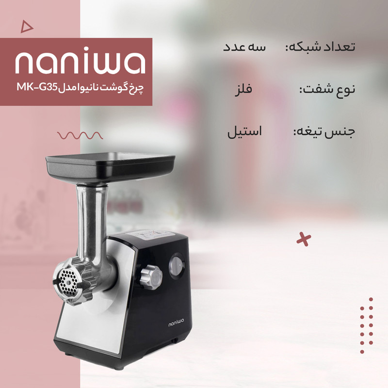 چرخ گوشت، تك كاره، نانيوا، مدل MK-G35، سازنده توليدي لوازم خانگي نانيوا، ايران، تك سرعته، بدون نمايشگر، توان مصرفي 180 W، جنس بدنه پلاستيكي