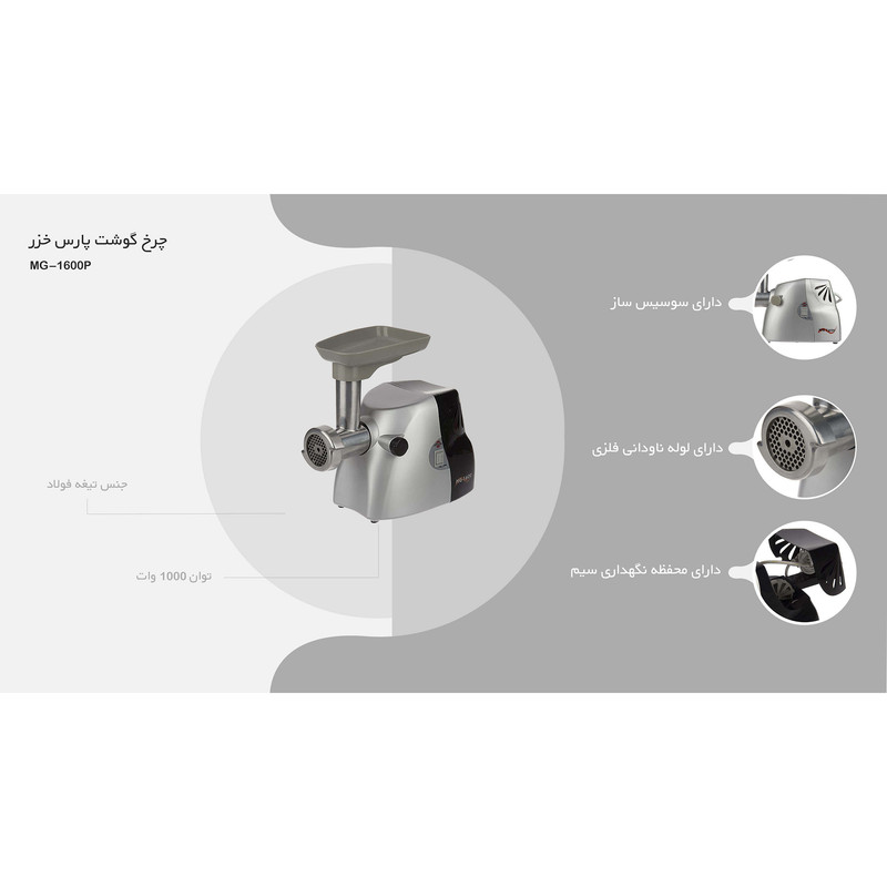 چرخگوشت «پارس خزر» (Pars Khazar) مدل «MG-1600P»، محصولی بسیار ساده با کاربری آسان و توان مصرفی مناسب است و قیمت کاملا مقرونبهصرفهای دارد. این چرخگوشت که در طبقهبندی رنگی ساده قرار میگیرد، با توان مصرفی 1000 وات و میزان خروجی 1200 گرم در دقیقه تولید شده است؛ همچنین این محصول به قابلیتهای سیستم چرخش معکوس و سوسیسساز هم مجهز است. از دیگر مشخصات کلی MG-1600P میتوان به دارابودن نشان استاندارد ملی ایران، محفظه برای نگهداری گوشت یا سبزی و جمعآوری سیم اشاره کرد. گفتنی است، همراه این محصول، ظرف پلاستیکی برای جمعآوری گوشت و سبزی چرخشده هم به کاربر ارائه میشود. شرکت بزرگ ایرانی پارس خزر، از سال 1347 با همکاری شرکت توشیبای ژاپن، آغاز به کار کرده است. این شرکت در زمینه ساخت لوازمخانگی، فعالیتهای گستردهای را در کشور انجام میدهد.