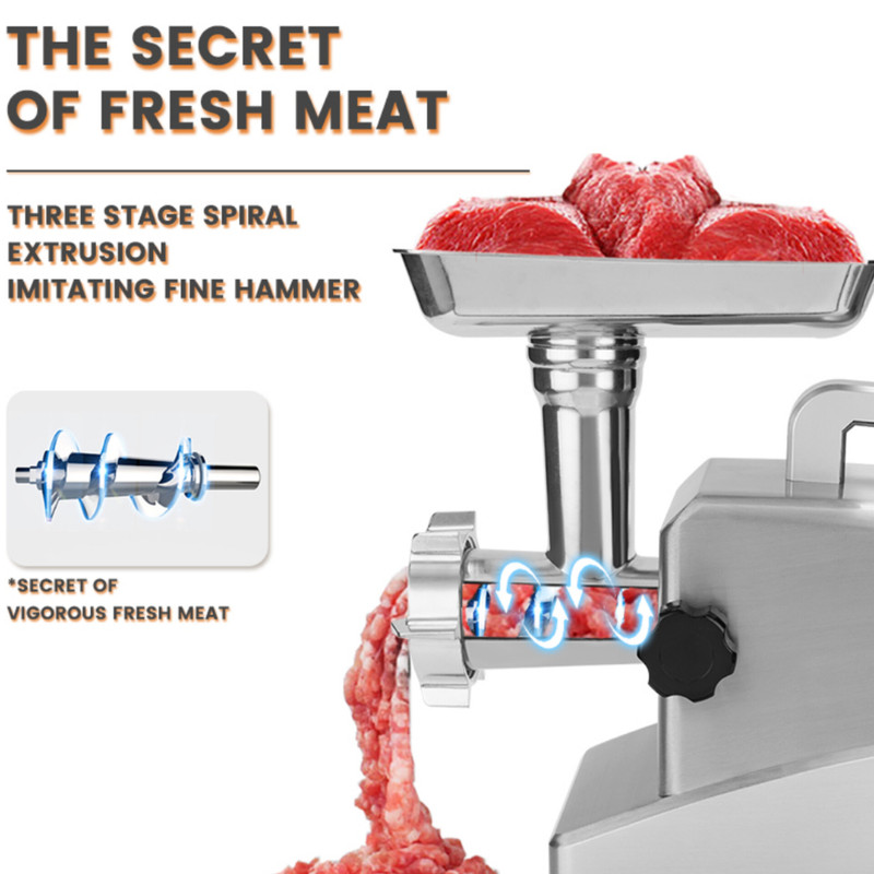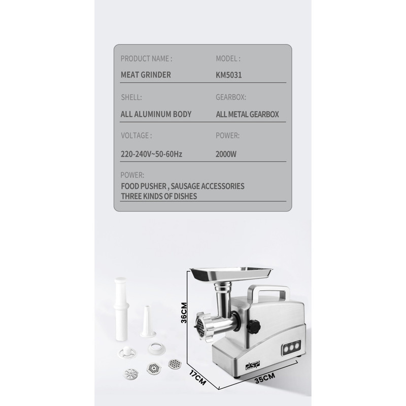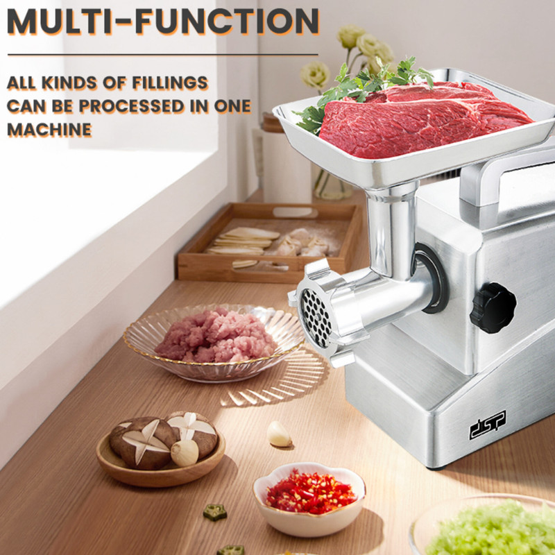 چرخگوشت دی اس پی مدل KM5031 یک دستگاه حرفهای و با کیفیت برای آشپزخانههای خانگی و نیمهحرفهای است که ترکیبی از قدرت، دوام و تنوع عملکرد را ارائه میکند. این دستگاه به موتور AC تمام مس 8840 با توان ۲۰۰۰ وات مجهز شده که حتی سختترین گوشتها را با سرعت و کیفیت بالا چرخ میکند. چرخدندهها و جعبه دنده از جنس استیل ضد زنگ و محفظه آلومینیومی دایکست ساخته شدهاند تا پایداری و طول عمر طولانی دستگاه تضمین شود، در حالی که تیغهها و صفحات برش استیل ضد زنگ با کیفیت عالی هستند و برش یکنواخت و سالمی را برای شما فراهم میآورند.