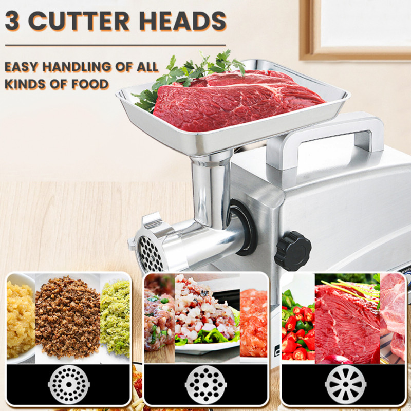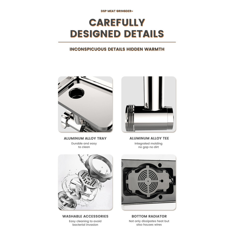 صفحه ورودی آلومینیومی (هاپر) و سینیهای متنوع این چرخگوشت، استفاده آسان و امکان پردازش انواع گوشت و ترکیبات را ممکن میکنند. علاوه بر این، دستگاه با اکسسوریهای استاندارد شامل فشاردهنده غذا (Food Pusher)، سری مخصوص سوسیس و سه صفحه برش در سایزهای ۴ میلیمتر، ۷ میلیمتر و شکل فن، تمامی نیازهای شما برای آشپزی و تولید محصولات گوشتی خانگی را پوشش میدهد. دسته حمل تعبیه شده و چراغ نشانگر آبی، کاربری راحت و ایمنی بیشتر را تضمین میکند.