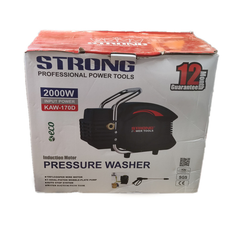 کارواش دینامی اینداکشن 2000 وات استرانگ مدل KAW170-D یک واتر جت یا کارواش خانگی پرقدرت اما جمع و جور است است. این دستگاه توسط شرکت استرانگ ساخته میشود. موتور محصول به سفارش شرکت سازنده اینداکشن یا دینامی تمام مس ساخته شده است. این محصول قدرت بالایی داشته و از یک موتور قدرتمند 2000 واتی برخوردار است. این موتور دارای پیستون هایی سه محوره از جنس استیل بوده که عملکرد خوبی دارند. از آنجایی که کارواش ها در شرایط مرطوب کار میکنند و احتمال خیس شدن آن ها بسیار زیاد است؛ شرکت استرانگ این محصول را به شکلی طراحی کرده که مقاومت بالایی دربرابر رطوبت داشته و موفق به اخذ استاندارد IPX-5 شده است.