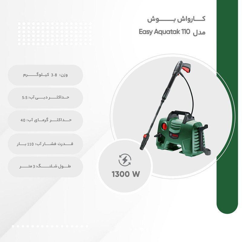 شرکت (Bosch) «بوش» یکی از بزرگ‌ترین و معروف‌ترین شرکت‌های تولید لوازم و دستگاه‌های خانگی و صنعتی است که سال‌هاست در این زمینه فعالیت می‌کند. این‌روزها کمتر کسی است که نام این برند معروف را نشنیده باشد و از کیفیت محصولاتش بی‌خبر باشد. این شرکت یکی از جدیدترین محصولاتش را به نام کارواش بوش مدل Easy Aquatak 110 به بازار عرضه کرده است.کارواش بوش مدل Easy Aquatak 110 را می‌توان محصولی تمام‌ عیار از شرکت بوش آلمان دانست که همیشه در تولید ابزار آلات صنعتی در دنیا بی رقیب بوده است . کارواش به‌صورت هوشمند عمل کرده و دارای سامانه توقف خودکار دستگاه است. این قابلیت باعث می‌شود تا هنگامی که کاربر با دستگاه کار نمی‌کند، دستگاه متوقف شده و در مصرف آب و برق صرفه‌جویی شود.این دستگاه توان بسیار بالایی برابر 1300 وات دارد که قادر است آب را با حداکثر فشار برابر 110 بار از نازل خود خارج کند. بزرگترین ویژگی این دستگاه کارواش پمپ تمام فلزی سه سیلندری آن می باشد . این دستگاه مجهز به سیستم پیشرفته فوم پاش و ساکشن می باشد . طول لنس این دستگاه 3 متر می باشد . بسیاری از موارد کیفی و زیبایی منحصر به فرد این دستگاه باعث شده این دستگاه در نوع خود در دنیا بی رقیب باشد .