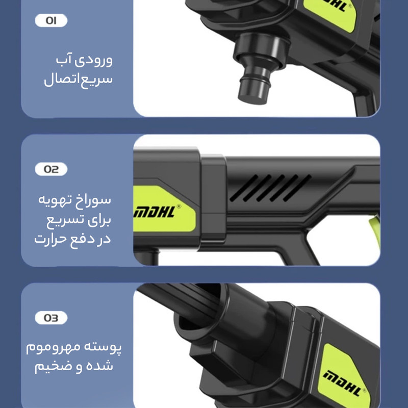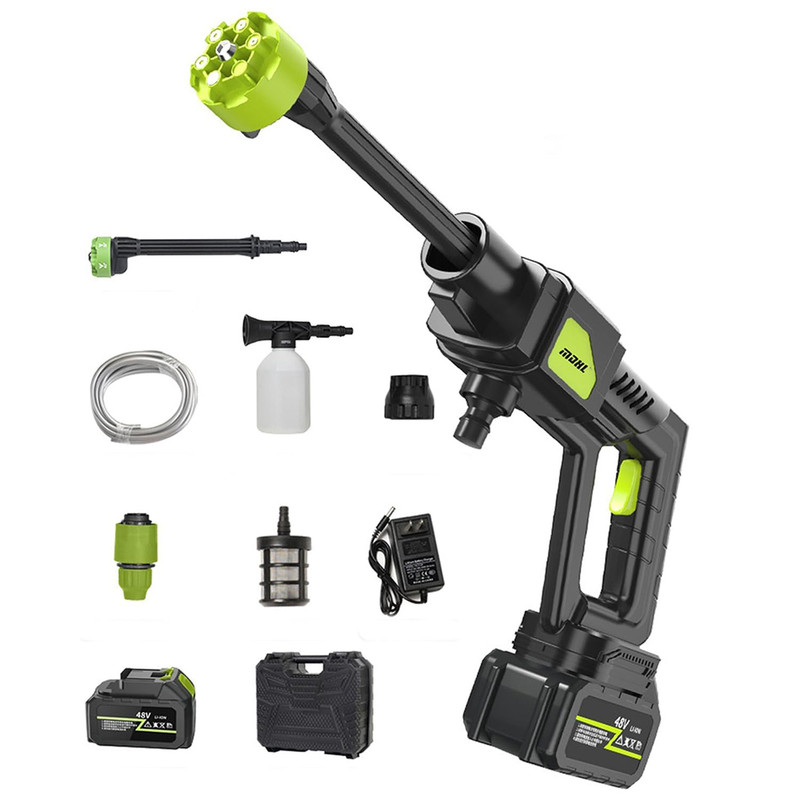 کارواش خانگی فوق از نوع شارژی مدل MDHL8100 برند MDHL همراه با پمپ آب ، فیلتر آب ، باطری لیتیومی قوی 48V ، شلنگ 6 متری ، شارژر مخصوص ، یک سری آب 6 حالته ، مخزن مواد شوینده ، رابط ها و کیف مخصوص میباشد.کارواش شارژی فوق دارای باتری 48V است که منبع پاشش آب را تامین میکند.