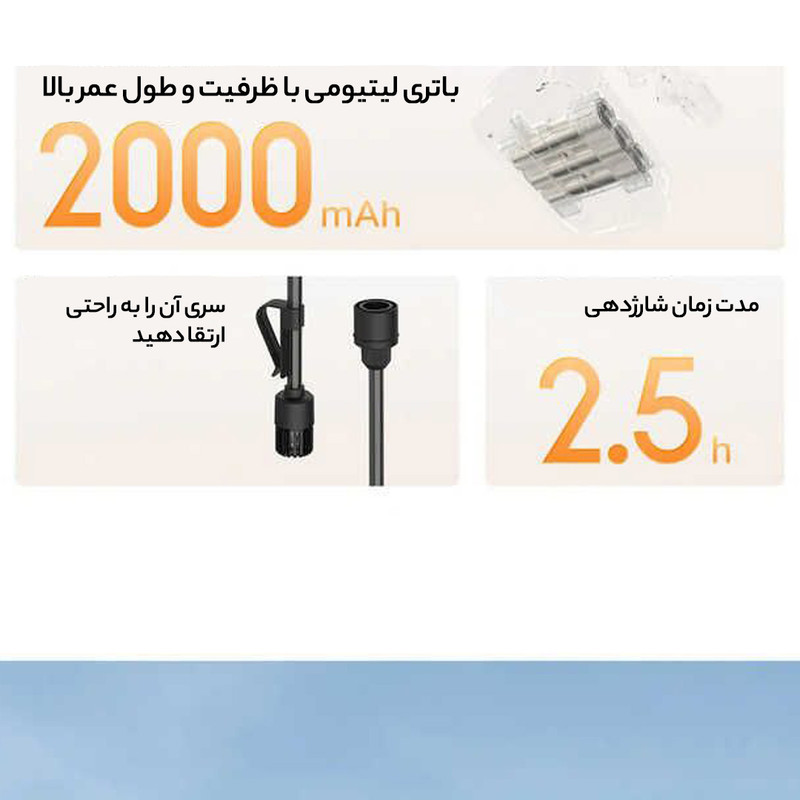 سایز300x309x80 میلی متر/ وزن1.1 کیلوگرم/ نوع باتریباتری لیتیوم یونی ظرفیت2000 میلی آمپر ساعت/ زمان شارژحدود 2.5 ساعت/ ظرفیت مخزن250 میلی لیتر/