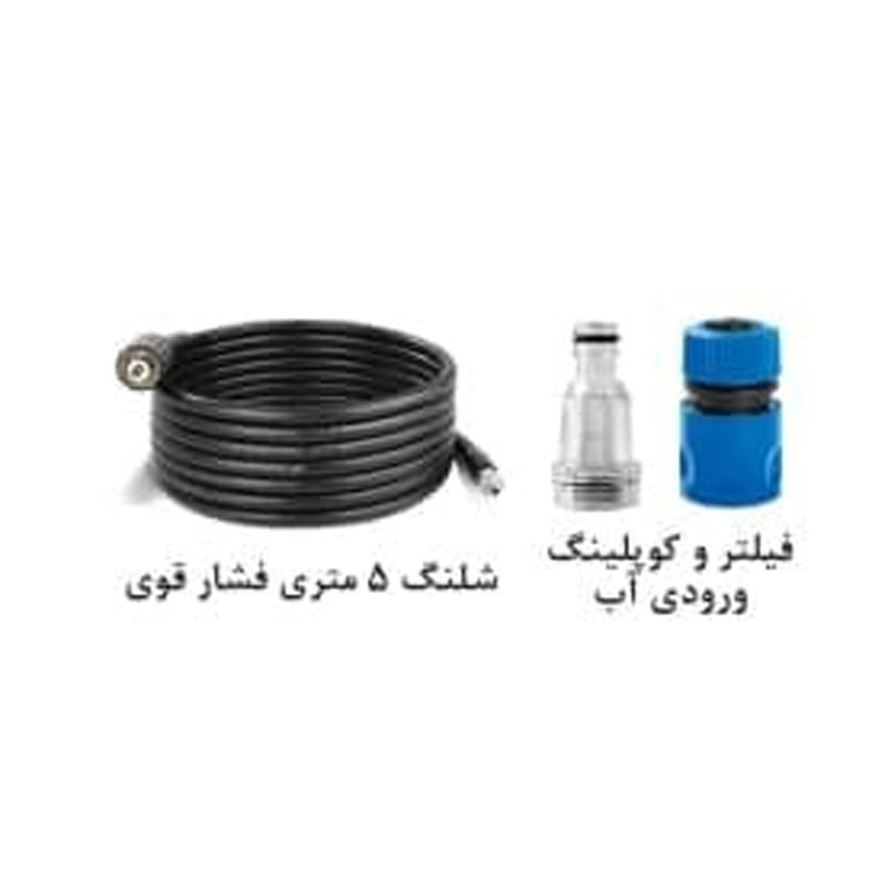 – فیلتر و کوپلینگ ورودی آب – شلنگ 5 متری فشارقوی آب – تفنگ با لوله فلزی – لاس قابل تنظیم