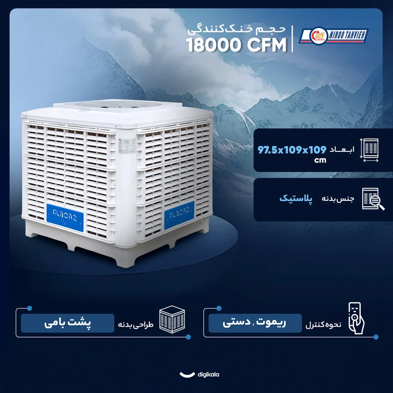 کولر آبی 18000U علاوه بر کنترل دستی با ریموت کنترل بیسیم نیز اداره میشود تا کاربر بتواند سرعت فن، وضعیت هوادهی و زمانبندی عملکرد را تنظیم کند.