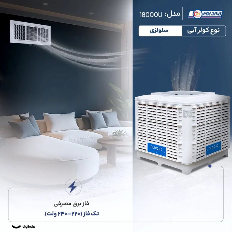 کولر آبی سلولزی ۱۸۰۰۰ نیرو تهویه البرز مدل 18000U یکی از پیشرفتهترین مدلهای صنعتی و خانگی است که با حجم خنککنندگی ۱۸۰۰۰ CFM و طراحی مهندسیشده برای فضاهای بزرگ بیش از ۱۲۰ متر مربع ساخته شده است. این دستگاه با طراحی پشتبامی و جهت خروجی هوای بالا (بالازن) برای محیطهایی که نیاز به انتقال باد به طبقات یا ارتفاعات دارند، گزینهای ایدهآل محسوب میشود. بدنه کولر از پلاستیک فشرده مقاوم با پلیمر آنتیUV ساخته شده که دوام بالایی در برابر اشعه آفتاب، رسوب و رطوبت فراهم میکند و طول عمر دستگاه را به طور چشمگیری افزایش میدهد.