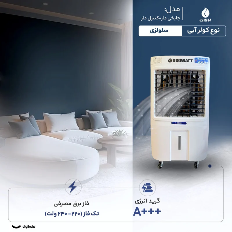 موتور کولر با برق تکفاز ۲۲۰ تا ۲۴۰ ولت کار میکند و در عین توان بالا، در گرید انرژی A+++ ردهبندی شده است؛ بدین ترتیب مصرف برق بهشدت پایین بوده و دستگاه در محدوده صدای کم فعالیت میکند. طراحی چرخدار و ظاهر جمعوجور با ابعاد ۵۰×۴۰×۹۰ سانتیمتر استفاده از آن را در هر محیطی آسان میسازد. اقلام همراه شامل ریموت کنترل و دفترچه راهنما است. در مجموع، کولر آبی سلولزی ۲۵۰۰۰ بروات مدل جایخیدار کنترلدار گزینهای هوشمند، قدرتمند و کممصرف برای کاربران خانگی و محیطهای کاری با نیاز به سرمایش قوی و قابلجابجایی است.