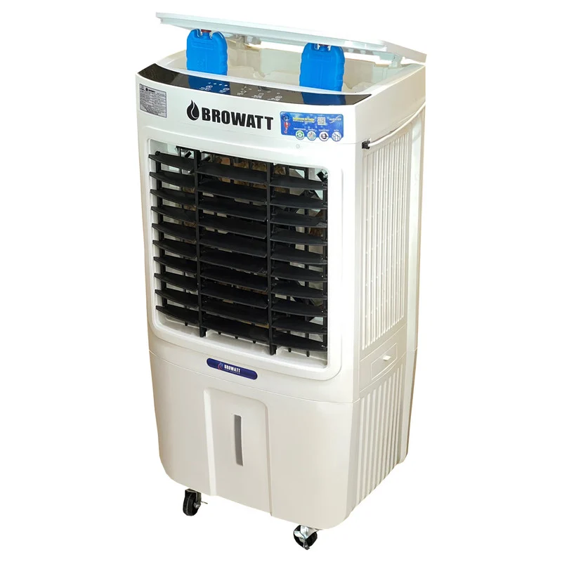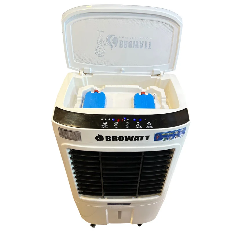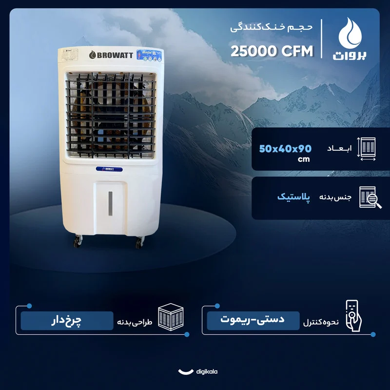 کولر آبی سلولزی ۲۵۰۰۰ بروات مدل جایخیدار کنترلدار ترکیبی از طراحی مدرن، قدرت هوادهی چشمگیر و مصرف انرژی بسیار پایین است که آن را به یکی از کارآمدترین کولرهای قابلحمل در کلاس خود تبدیل کرده است. این دستگاه با ظرفیت ۲۵۰۰۰ CFM جریان باد خنک و گستردهای ایجاد میکند و گزینهای مناسب برای فضاهای ۵۰ تا ۷۰ متر مربع محسوب میشود. طراحی چرخدار و قابلحمل آن به کاربر اجازه میدهد دستگاه را بدون نیاز به نصب ثابت در نقاط مختلف منزل یا محل کار جابهجا کند. بدنه از پلاستیک فشرده با مقاومت بالا ساخته شده که ضمن سبکی، در مقابل پوسیدگی و تماس دائمی با رطوبت کاملاً مقاوم است.