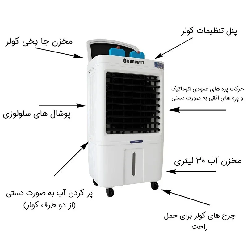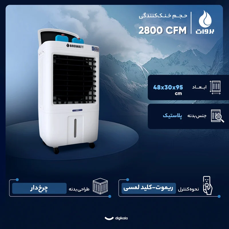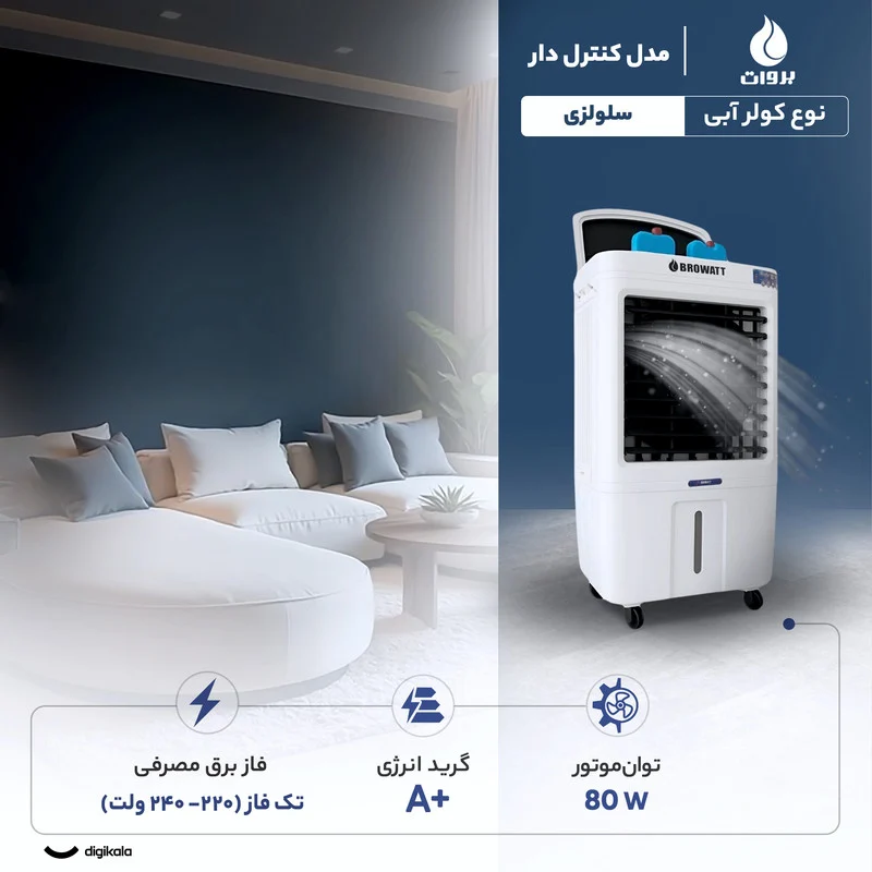 در مجموع، کولر آبی سلولزی ۲۸۰۰ بروات مدل کنترلدار با امکانات دیجیتال، کنترل هوشمند، پدهای سلولزی پیشرفته و طراحی قابلحمل، انتخابی مدرن، زیبا و اقتصادی برای خنکسازی فضاهای متوسط در فصل گرما است.