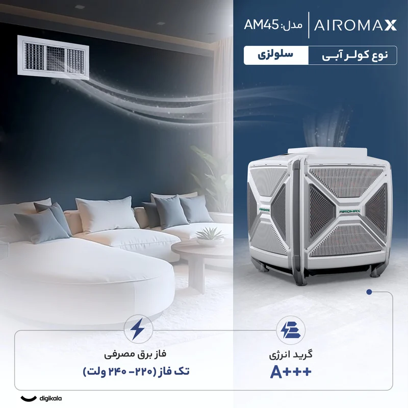 کولر آبی ایرومکس مدل AM45 یک دستگاه خنککننده سلولزی با طراحی بالازن و مناسب برای نصب پشت بامی است. حجم خنککنندگی این مدل ۴۰۰۰ CFM (فوت مکعب در دقیقه) است. با وجود ظرفیت متوسط، به دلیل راندمان بالا برای متراژهای بیش از ۱۲۰ متر مربع نیز مناسب قلمداد شده است (با توجه به شرایط محیطی).