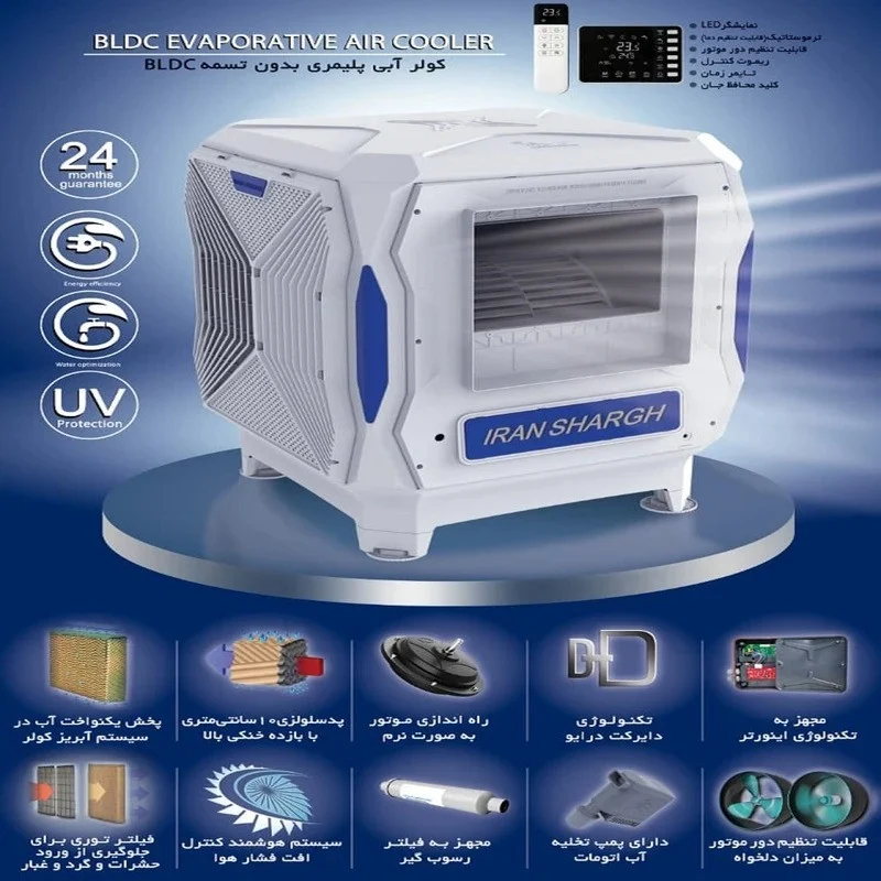 در بخش کنترل، کولر آبی سلولزی 8000 ایران شرق مدل 85P به ریموت کنترل، کلیدهای لمسی و نمایشگر دیجیتال مجهز است که مدیریت سرعت باد، حالتهای کاری و میزان آبرسانی را سادهتر میکند. این سبک کنترل مدرن، تجربه کاربری راحتتری نسبت به سیستمهای قدیمی فراهم میسازد و امکان تنظیم دستگاه از راه دور را نیز فراهم میکند.