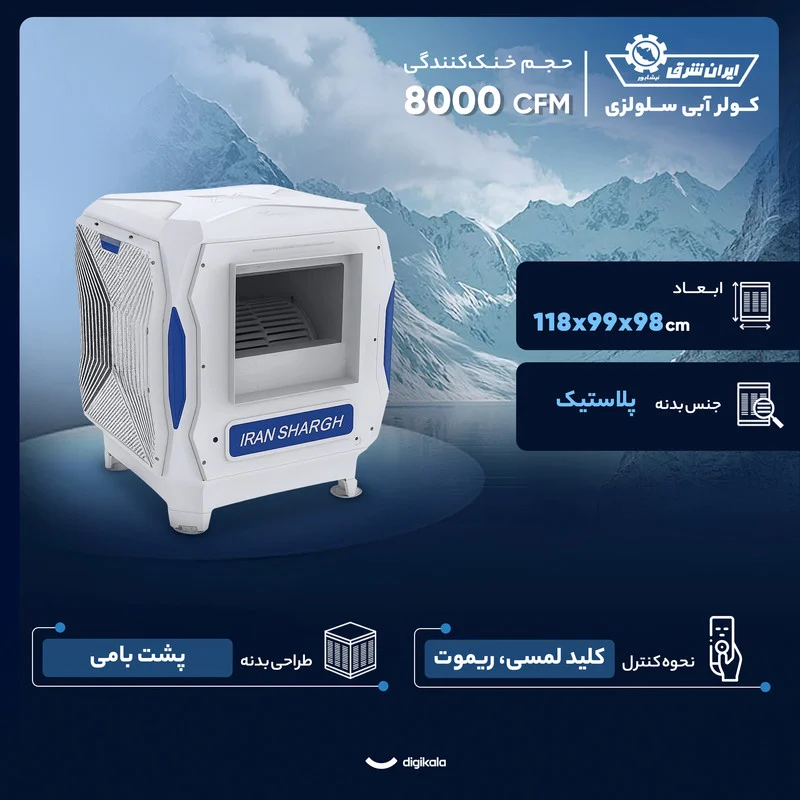 کولر آبی سلولزی 8000 ایران شرق مدل 85P یک دستگاه قدرتمند و مناسب فضاهای بزرگ است که با حجم خنککنندگی ۸۰۰۰ CFM میتواند هوای خنک و یکنواختی را در محیطهای بالای ۱۲۰ متر مربع ایجاد کند. طراحی پشتبامی این دستگاه برای نصب ثابت و استفاده طولانیمدت در منازل، فروشگاهها و محیطهای کاری مناسب است. بدنه پلاستیکی مقاوم در برابر رطوبت و نور خورشید، دوام کولر را افزایش میدهد و ابعاد ۹۹ × ۹۹ × ۱۱۸ سانتیمتری امکان قرارگیری مناسب روی پشتبام را فراهم میکند. گرید انرژی A نیز نشاندهنده مصرف بهینه و عملکرد اقتصادی این مدل است.