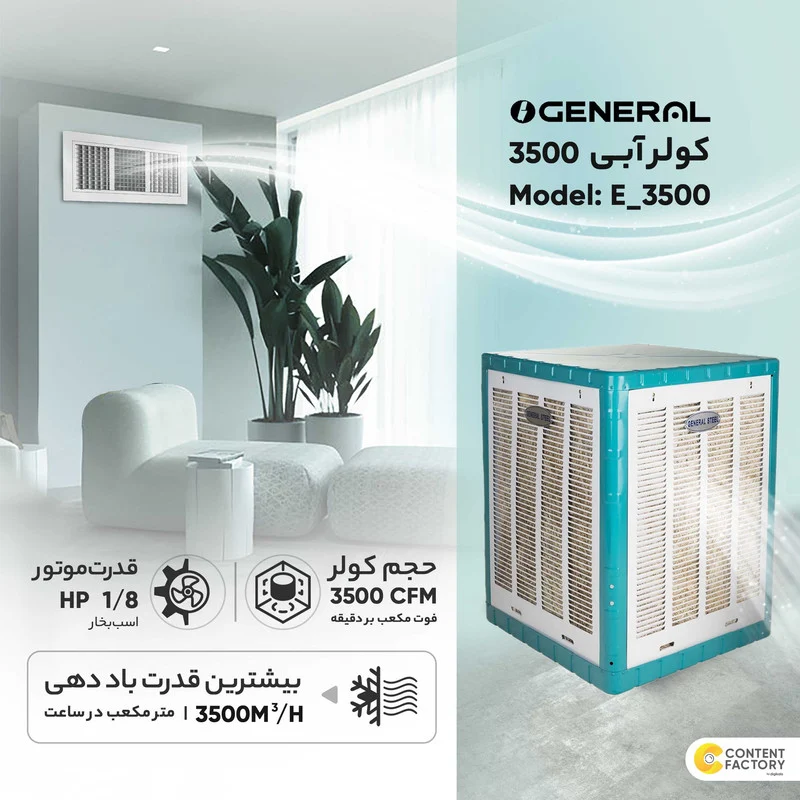 مدل 3500 جنرال استیل این کولر آبی با موتور 0.33 اسب بخار، توانایی خنک کردن قوی را ارائه میدهد. این کولر با رده انرژی G و بازده انرژی 23 درصد، از نظر مصرف انرژی نیز به عملکرد برتری دست یافته است. به ویژه در مناطق خشک، عملکرد این دستگاه بسیار مناسب است.