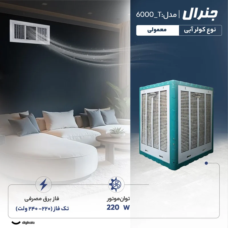 اگر به دنبال یک کولر آبی قدرتمند، باکیفیت و مناسب برای فضاهای متوسط تا بزرگ هستید، کولر آبی 6000 جنرال مدل T_6000 میتواند یک گزینه عالی برای شما باشد. این کولر با طراحی دیواری و عملکرد قابل اطمینان خود، به شما کمک میکند تا در روزهای گرم تابستان از هوای خنک و مطبوع لذت ببرید. قدرت خنککنندگی این کولر 6000 CFM است که برای محیطهایی با مساحت بین 70 تا 120 متر مربع کاملاً مناسب میباشد. با چنین ظرفیتی میتوانید این کولر را برای خانه، محل کار، فروشگاه یا کارگاه خود استفاده کنید و خیلی سریع فضا را خنک کنید. جنس بدنه فلزی و مقاوم در برابر زنگزدگی یکی از ویژگیهای مثبت این کولر است که باعث افزایش طول عمر دستگاه میشود. همچنین این کولر از پوشالهای معمولی بهره میبرد که دسترسی و تعویض آنها بسیار آسان است. سیستم کنترل دستی ساده و تنظیم خودکار سطح آب با فلوتر مکانیکی از دیگر مزایای این کولر است که کار کردن با آن را برای همه افراد راحت میکند. شما میتوانید با اتصال کولر به آب شهری بدون نگرانی از بابت پر شدن مخزن، از عملکرد بیوقفه دستگاه لذت ببرید. این کولر با دهانه خروجی باد 60×60 سانتیمتری و حداکثر قدرت باددهی 8000 متر مکعب در ساعت هوای خنک را به خوبی و با قدرت در محیط پخش میکند. همچنین استفاده از موتور و پمپ آب با کیفیت بالا (موتوژن تبریز با سیمپیچ مس) تضمینکننده عملکرد مطمئن و دوام طولانی کولر است. اگر یک کولر آبی پرقدرت، اقتصادی و مناسب برای تابستان میخواهید، کولر آبی 6000 جنرال T_6000 با مصرف برق تک فاز 220 ولت، بدنه مستحکم و کاربری آسان، میتواند یکی از بهترین انتخابهای شما باشد.