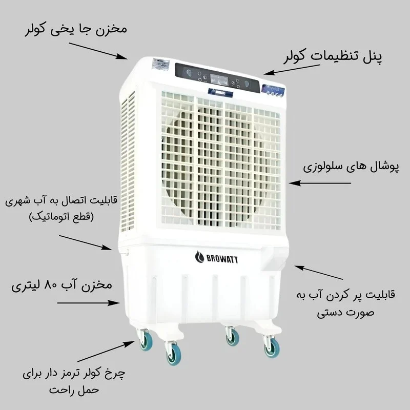 امروزه با گرم تر شدن شدیدا هوا طی سالیان اخیر نیاز به استفاده برای کولر چه آب و چه گازی برای انسان ها یکی از واجبات بوده است. کولرهای آبی پرتابل که با نام اختصاری پرتابل بیشتر شناخته می شوند سهم بیشتری از بازار هدف نه تنها در ایران بلکه دنیا را فرا گرفته اند. کولر پرتابل سلولوزی سایز بزرگ بروات مدل P-BR 32000 یکی از محصولات جدید سرمایشی شرکت بروات است که نه تنها در ایران بلکه در کشورهای حوزه خلیج فارس نیز به دلیل کیفیت ساخت در بدنه و سلولوز موجود در آن ها پر فروش هستند. این کولر با طراحی خاص و منحصر بفرد خود با توربین بزرگ و قدرت پرتاب بالا نیازهای یک متراژ 100 تا 140 متری را جواب می دهد. این کولر مجهز به نمایشگر دیجیتال و کنترل از راه دور دارد است که این امکان را به شما میدهد تا سرعت باد، نوع باد، فعال کردن پره های عمودی، … را کنترل کنید. این کولر از مخزن بزرگ 80 لیتری خود بهره می برد به طوری که هوشمند بوده و جریان آب را کنترل می کند. شما به صورت دستی نیز می توانید مخزن 80 لیتری را پر کنید. هوادهی 3800 متر مکعب در ثانیه این کولر خود را از بقیه رقبا جدا کرده و بهترین هوادهی و بازخود را به شما می دهد. در بالای این کولر محفظه جا یخی وجود دارد که 3 عدد جا یخی در بالای کولر قرار میگیرد. کاربد این جا یخی به این صورت است که اگر خواستید برودت کولر را بیشتر کنید باید این جا یخی ها را پر از آب کرده و در یخچال فریزر گذاشته تا یخ بزند. بعد از یخ زدن در بالای کولر بگذارید. موقعی که آب از مخزن به سمت بالا بیاید، آب از روی جا یخی ها رد شده و برودت هوا را بیشتر خواهد کرد. این محصول موقع کار کم صدا بوده و لغزشی ایجاد نمی کند. 4 چرخ زیر کولر نیز این امکان را به شما می دهد تا به راحتی این کولر را حمل کنید. ویژگی بارز این محصول این است که به نسبت و کیفیت بالا جایگزین بسیار توجیه پذیری نسبت به کولر های آبی فلزی و همین طور کولر های گازی دارد. پوشال های این کولر از نوع سلولوزی بوده و برای سلامتی شما هم ضرری ایجاد نمی کند.