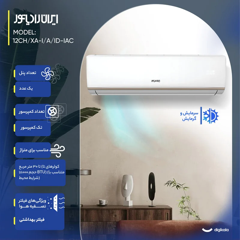 اسپلیت دیواری ایران رادیاتور با ظرفیت 12000 BTU مناسب برای فضای 17 تا 25 متر مربع ( ارتفاع سقف 2.8 متر) و با قابلیت سرمایش و گرمایش کولرگازی ایران رادیاتور مجهز به کمپرسور GMCC شرکت توشیبا همراه با گاز R410 دوستار محیط زیست بوده و دارای اواپراتور و کندانسور با فین های طلایی مقاوم در برابر خوردگی می باشد. این ویژگی ها، کولر ایران رادیاتور را به محصولی مناسب جهت کارکرد در کلان شهرها و مناطقی که دارای آلودگی هوا هستند و همچنین مناطق با رطوبت بالای هوا تبدیل میکند.