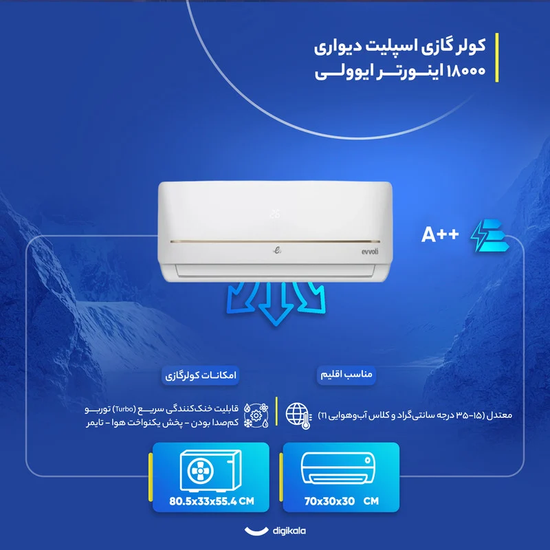 کولر گازی ۱۸ هزار اینورتر ایوولی مدل EVDC-18K-MD-1، ترکیبی از کارایی، مصرف بهینه و طراحی کاربردی است که برای فضاهایی با متراژ متوسط طراحی شده است. این اسپلیت دیواری با ظرفیت ۱۸۰۰۰ BTU/hr، برای اتاقها، سالنهای مسکونی یا دفاتر تا حدود ۵۰ متر مربع مناسب بوده و قابلیت استفاده در تمامی فصول را دارد.