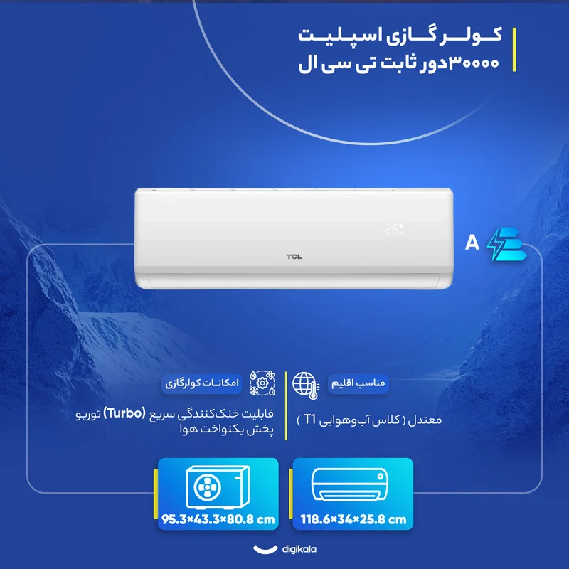 کولر گازی اسپلیت دیواری 30000 دور ثابت تی سی ال مدل TAC‑30CHSA/XA73N یک دستگاه توانمند برای فضاهای بزرگ است و با ظرفیت ۳۰۰۰۰ BTU/hr می‌تواند به‌راحتی محیط‌های ۵۰ تا ۷۰ متر مربع را تحت پوشش قرار دهد. عملکرد سرمایش و گرمایش این مدل باعث می‌شود برای تمام فصول سال کارایی داشته باشد و استفاده از گاز مبرد R410A راندمان بالاتری در مقایسه با نسل‌های قدیمی‌تر ایجاد می‌کند. کمپرسور روتاری با برد الکترونیکی دور ثابت، ساختاری ساده‌تر و مقاوم‌تر ارائه می‌دهد و برای اقلیم معتدل (T1) به‌خوبی بهینه‌سازی شده است. این مدل محدوده دمایی وسیع از منفی ۷ تا ۴۷ درجه سانتی‌گراد را پوشش می‌دهد و در شرایط آب‌وهوایی متنوع عملکرد پایداری دارد.