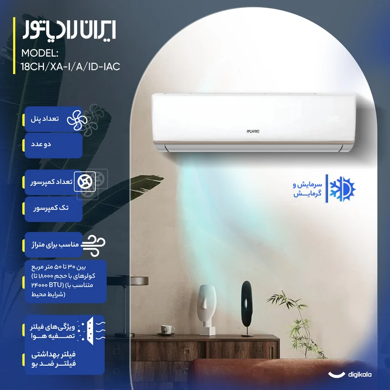اسپلیت دیواری ایران رادیاتور با ظرفیت 18000 BTU مناسب برای فضای 25 تا 35 متر مربع ( ارتفاع سقف 2.8 متر) و با قابلیت سرمایش و گرمایش به بازار عرضه می شود. کولرگازی ایران رادیاتور مجهز به کمپرسور GMCC شرکت توشیبا همراه با گاز R410 دوستار محیط زیست بوده و دارای اواپراتور و کندانسور با فین های طلایی مقاوم در برابر خوردگی می باشد. این ویژگی ها، کولر ایران رادیاتور را به محصولی مناسب جهت کارکرد در کلان شهرها و مناطقی که دارای آلودگی هوا هستند و همچنین مناطق با رطوبت بالای هوا تبدیل میکند.