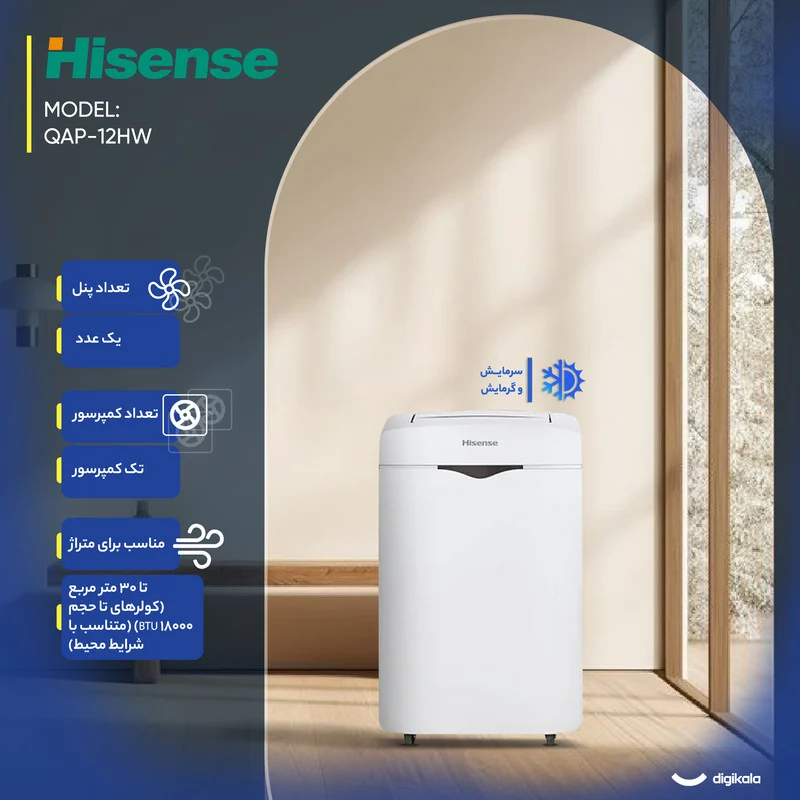 کولر گازی پرتابل ۱۲۰۰۰ هایسنس مدل QAP-12HW گزینهای کاربردی برای فضاهای کوچک تا ۳۰ متر مربع است که هم سرمایش و هم گرمایش را در یک دستگاه جمع کرده است. این مدل با کمپرسور روتاری و گاز مبرد R32 عملکردی کارآمد و سازگار با محیط زیست دارد. استفاده از گاز R32 به بهبود راندمان دستگاه کمک کرده و در عین حال آسیب کمتری به لایه اوزون وارد میکند.