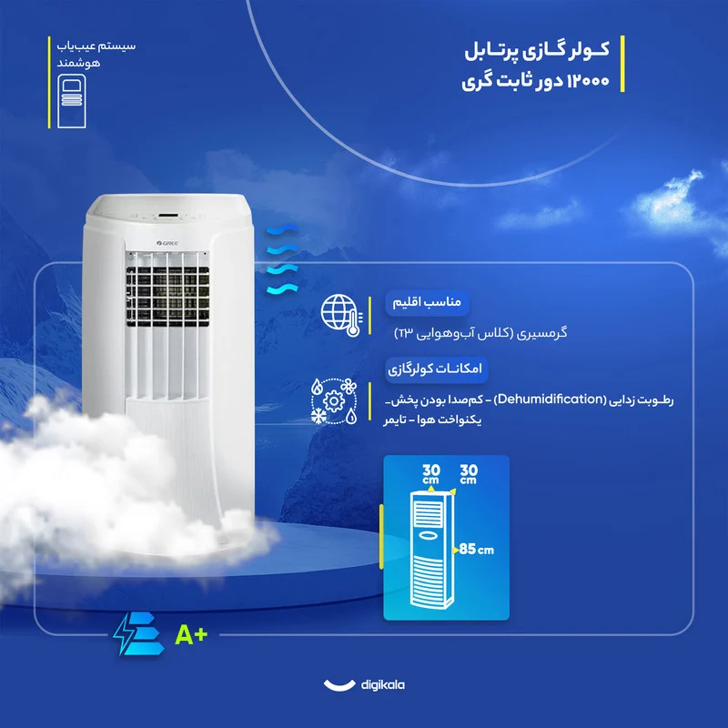 از نظر امکانات، وجود تایمر، حالت توربو، رطوبتزدایی، فیلتر بهداشتی، پخش یکنواخت باد و سیستم عیبیابی هوشمند، تجربهای کارآمد و امن را برای مصرفکننده به همراه دارد. ریموت کنترل دیجیتال با طراحی ارگونومیک نیز امکان مدیریت کامل دما، فن و سایر عملکردها را از راه دور فراهم میکند. در کنار این ویژگیها، نمایشگر LED روی بدنه و صدای ۵۳ دسیبل، تعادلی بین کارایی و راحتی فراهم کرده است. با ابعادی در حدود ۸۵ سانتیمتر ارتفاع و طراحی عمودی، این کولر پرتابل ضمن اشغال فضای کم، بهراحتی در گوشهای از اتاق قرار میگیرد و بدون نیاز به نصب دائمی، خنکای مؤثر را به همراه میآورد.