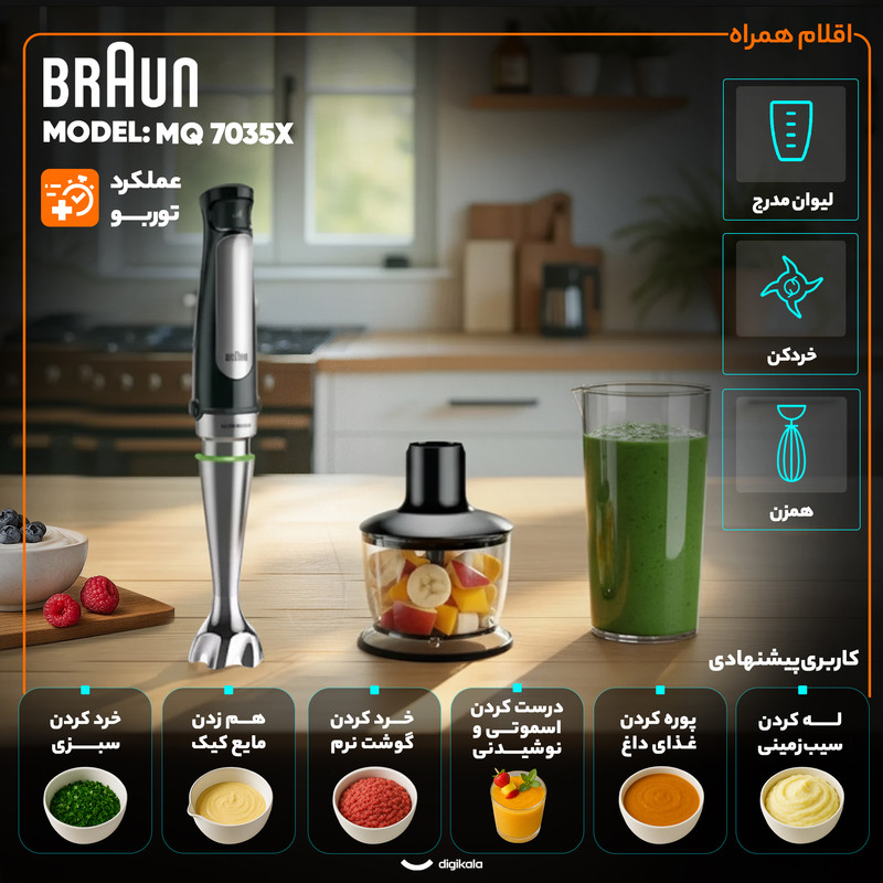 گوشت کوب برقی براون مدل 7035 به عنوان بهترین گوشتکوب برقی جهان در سال 2019 شناخته شد که قدرتمندترین موتور همزن قلمی و گوشتکوب برقی را در خود جای داده است. موتور گوشتکوب حرفه ای 7035 براون دارای توان مصرفی 1000 وات است. برخی ازقابلیت های این دستگاه شامل غذاساز،مخلوط کن،خرد کن کوچک،خرد کن بزرگ،رنده برقی،آسیاب،روندو سبزی خرد کن،همزن سس و کیک،خرد کن میباشد.