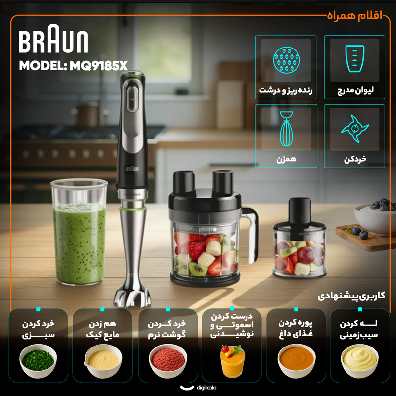 | کاربری پیشنهادی | پوره کردن غذای داغ، خرد کردن سبزی، خرد کردن گوشت نرم، خرد کردن یخ، درست کردن اسموتی و نوشیدنی، له کردن سیب زمینی، هم زدن مایع کیک |