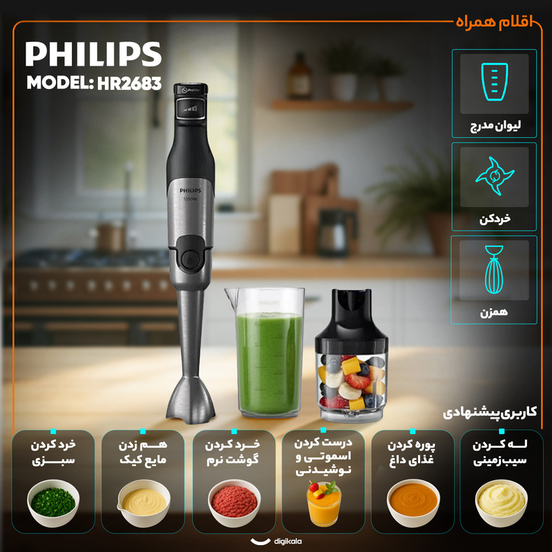گوشتکوب برقی چندکاره فیلیپس مدل HR2683 با توان ۱۲۰۰ وات یکی از پیشرفتهترین و قدرتمندترین مدلهای سریجدید این برند بهشمار میرود که برای کاربرانی طراحی شده است که دقت، سرعت و تنوع عملکرد در آشپزخانه را همزمان میخواهند. این دستگاه با توان بالا و طراحی ارگونومیک، قابلیت اجرای چندمنظوره از جمله خرد کردن، پوره کردن، هم زدن و تهیه اسموتیها را با کیفیتی حرفهای فراهم میسازد.