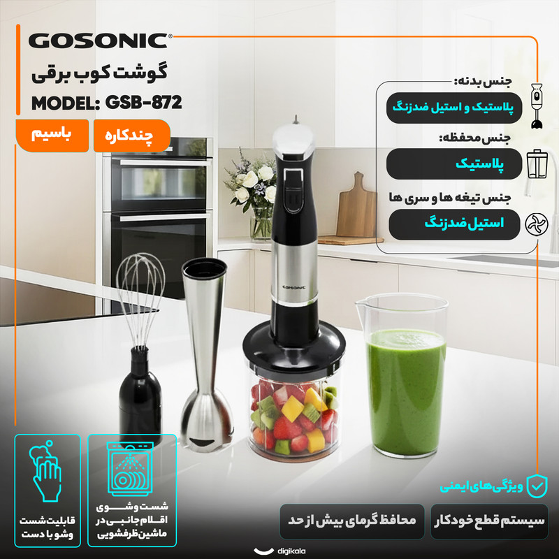 ویژگی های ایمنی شامل محافظ گرمای بیش از حد و سیستم قطع خودکار در گوشت کوب برقی چندکاره 300 وات گوسونیک مدل GSB-872 از آسیب احتمالی به موتور جلوگیری می کند و عملکرد دستگاه را در استفاده طولانی مدت پایدارتر می کند. امکان شست و شوی اقلام جانبی در ماشین ظرفشویی نیز روند نظافت را ساده تر می کند و باعث می شود دستگاه در استفاده روزمره کاربردی تر باشد.
