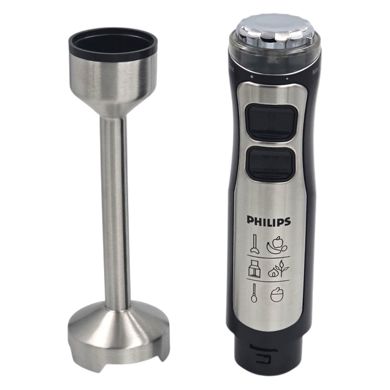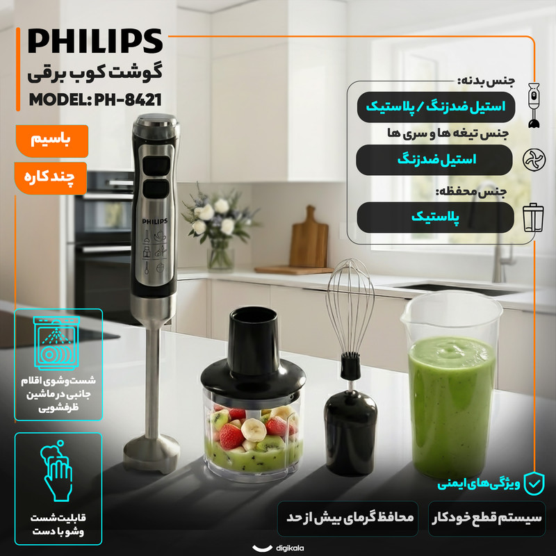 گوشت‌کوب برقی چندکاره ۳۰۰۰ وات فیلیپس مدل PH-8421 بدنه‌ای ترکیبی از استیل ضدزنگ و پلاستیک مقاوم دارد که علاوه‌بر زیبایی، دوام و استحکام بالایی فراهم می‌کند. تیغه‌های از جنس استیل ضدزنگ با طراحی چهارپره، قابلیت خردکردن و پوره‌سازی سریع و یکدست را ارائه می‌دهند. این محصول دارای لیوان مدرج ۵۰۰ میلی‌لیتری و یک محفظه خردکن با ظرفیت ۶۰۰ میلی‌لیتر است که برای خرد کردن سبزی، مغزها و مواد غذایی مختلف بسیار کاربردی عمل می‌کنند. کنترل دستگاه با سیستم دکمه‌ای و چرخشی انجام می‌شود و امکان استفاده در دو سرعت متفاوت را فراهم می‌سازد تا بسته به نوع مواد غذایی، بهترین نتیجه حاصل شود.