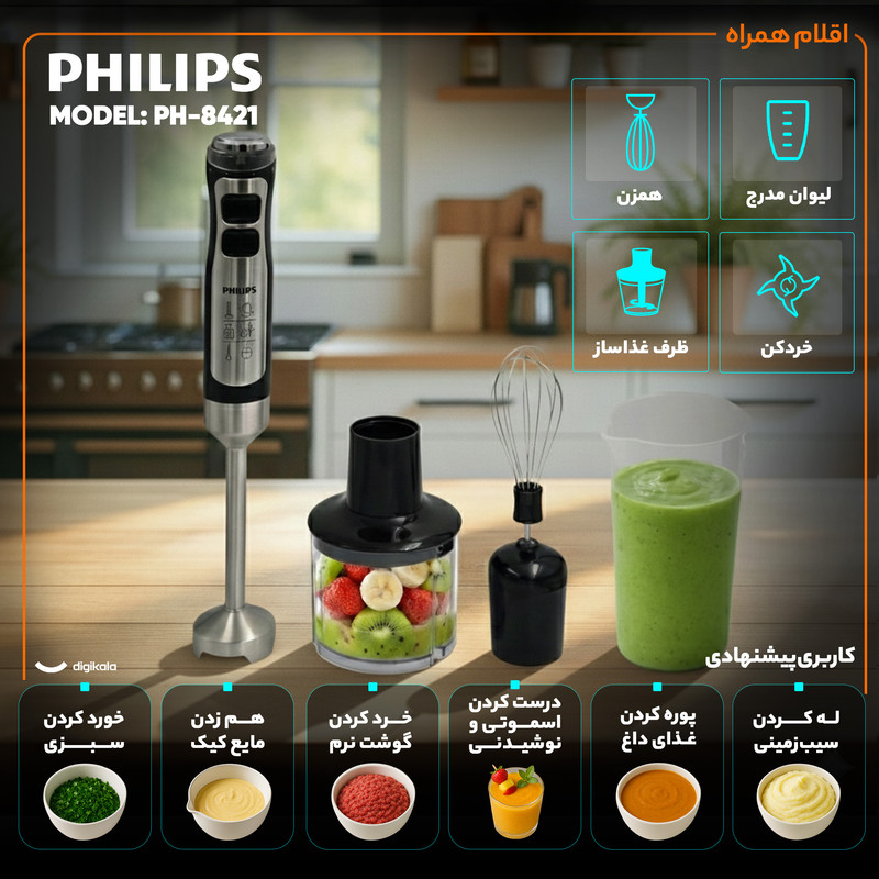گوشت‌کوب برقی چندکاره ۳۰۰۰ وات فیلیپس مدل PH-8421 مجموعه‌ای از اقلام همراه شامل لیوان مدرج، همزن، محفظه خردکن و دفترچه راهنما را در اختیار کاربر قرار می‌دهد. وجود سری همزن باعث می‌شود دستگاه برای تهیه مایع کیک، خامه سبک، نوشیدنی‌ها و اسموتی‌ها نیز کاربرد داشته باشد و عملاً جای چند وسیله مختلف را در آشپزخانه بگیرد. طراحی چندمنظوره و سیستم اتصال آسان سری‌ها موجب شده تعویض قطعات به‌سرعت و بدون دردسر انجام شود.