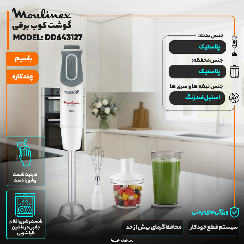 «MOULINEX» یکی از برند های معروف شرکت «SEB» فرانسه در زمینه تولید لوازم برقی است که دستگاههایی با کیفیت بالا و قیمتهای مناسب تولید میکند. این گوشتکوب برقی چند کاره هم یکی از تولیدات خوب این شرکت بزرگ است که از کیفیت و قدرت بالایی برخوردار است. دستگاه «DD643127 » شامل گوشتکوب، همزن و خردکن و لیوان پلی کربنات می باشد و یک وسیله چندکاره بسیار کاربردی است. قدرت این دستگاه 800 وات است و 10 سرعت به اضافه دکمه توربو دارد. تیغه گوشتکوب 4 پره است جنس تیغهها از استیل ضدزنگ و به سفارش مولینکس توسط شرکت زولینگن آلمان ساخته شده است و با تکنولوژی جدید POWELIX( یعنی چرخش دورانی تیغه ها و 30 درصد سریع تر مواد را میکس میکند ) از پس خرد کردن و له کردن موادغذایی مختلف بر میآید. ، بدنه دستگاه از جنس پلاستیک ABS است. دسته و بدنه دستگاه کاملا ارگونومیک طراحی شدهاند و هنگام کار کردن به خوبی میتوانید روی حرکت آن تسلط داشته باشید.