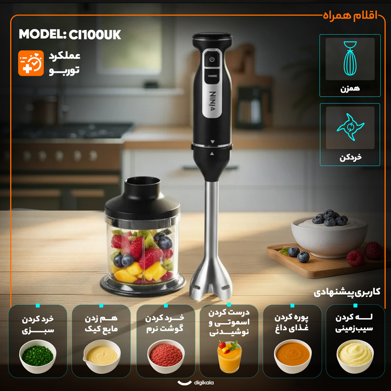 گوشتکوب برقی چندکاره نینجا مدل CI100UK با توان ۸۵۰ وات یکی از قدرتمندترین محصولات خانگی در رده خود محسوب میشود که برای آشپزخانههای حرفهای و خانگی طراحی شده است. این دستگاه چندکاره با طراحی ارگونومیک و کاربری آسان، امکان انجام مجموعهای از کارها نظیر خرد کردن یخ، تهیه پوره غذاهای داغ، خرد کردن گوشت نرم و سبزیجات، ترکیب مواد مایع برای کیک و تهیه انواع اسموتی و نوشیدنی را فراهم میآورد.