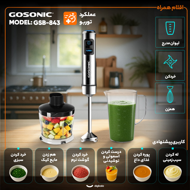 | کاربری پیشنهادی | پوره کردن غذای داغ، خرد کردن سبزی، خرد کردن گوشت نرم، خرد کردن یخ، درست کردن اسموتی و نوشیدنی، له کردن سیب زمینی |