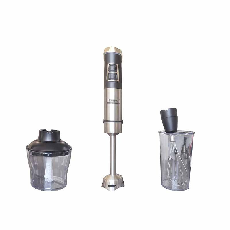 - سایر توضیحات: دکمه روشن/خاموش و دکمه توربو کنترل سرعت متغیر چراغ LED با نور آبی تیغه های استیل ضدزنگ میله ی استیل ضدزنگ لوازم جانبی: خردکن، همزن تخم مرغ و لیوان 220 240 ولت 50/60 هرتز، 1200 وات طراحی آلمان