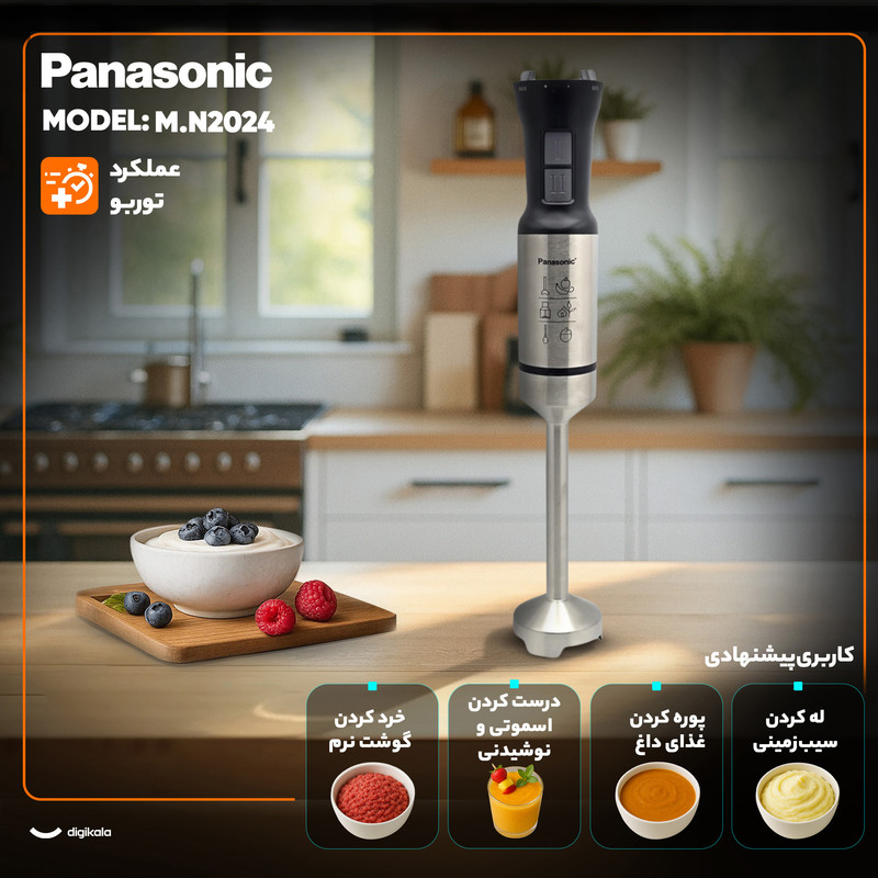 پاناسونیک M.N2024 از موتور ۱۵۰۰ واتی با بهرهوری انرژی بالا استفاده میکند که توان لازم برای آمادهسازی ترکیبات نرم تا مواد غذایی سختتر را فراهم میآورد. تیغه چهارپره از جنس استیل ضدزنگ سختکاریشده بوده و در طراحی آن از فناوری ضدپاشش استفاده شده است تا هنگام پوره یا اسموتیسازی، مواد به بیرون نپاشند. سرعت چرخش بالا همراه با کنترل متغیر، به دستگاه اجازه میدهد در ترکیب مواد داغ، خرد کردن یخ و تهیه نوشیدنیهای غلیظ نتیجهای کاملاً یکنواخت و نرم ایجاد کند.