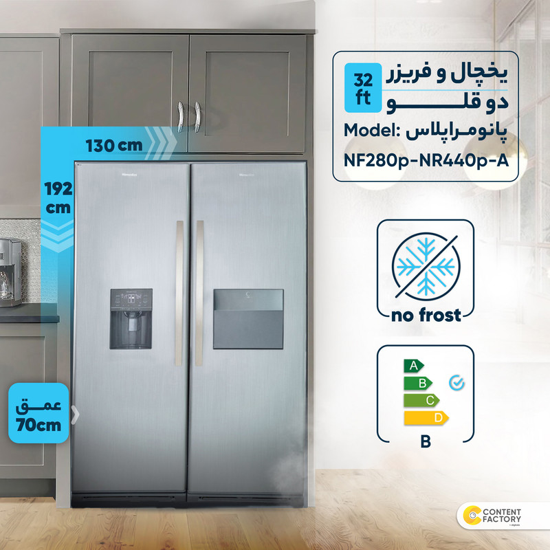یخچال و فریزر دوقلو هیمالیا مدل NF280p-NR440p از تولیدات برند هیمالیا و مجهز به آبسردکن و یخساز اتوماتیک است. کنترل الکترونیکی هوشمند مجهز به سیستم عیبیاب از قابلیتهای مهم آن به شمار میرود. یخچال این محصول دارای محفظههای نگهداری میوه و سبزیجات همراه با کنترل رطوبت (Moisture Balance) است که به همین دلیل مواد غذایی و اقلام خوراکی قرار گرفته در این محفظهها مدت زمان طولانیتری باطراوت و تازه میمانند. LED داخلی و نمایشگر لمسی از دیگر ویژگیهای یخچال و فریزر هیمالیا مدل پاناروما هستند. شرکت سازنده هنگام تولید این محصول آن را به فیلتر آب مجهز کرده است بنابراین از تهیهی آب تصفیه شده برای آشامیدن بینیاز خواهید بود. هوم بار قرار گرفته در قسمت یخچال امکان دسترسی شما به مواد غذایی و خوراکیهایی را که بیشتر مورد استفاده قرار میگیرند فراهم میکند و میتوانید بدون باز کردن درب اصلی یخچال از آنها استفاده کنید. به این ترتیب مصرف انرژی محصول هم بهینهتر خواهد بود.