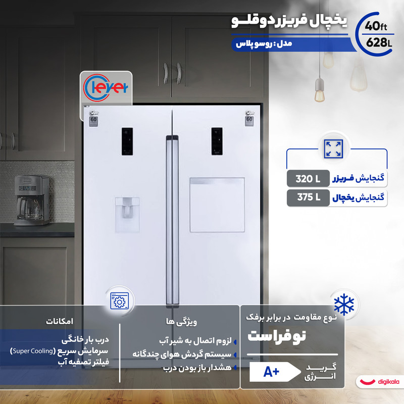 یخچال فریزر دوقلو کلور مدل روسو پلاس، یکی از مدلهای پیشرفته از یخچال های دوقلو است که دارای سیستمهای پیشرفته کنترل وضعیت یخچال، سیستم ضدبرفک اینورتر و مجهز به یخساز اتوماتیک میباشد؛ کمپرسورهای کم مصرف اینورتر در یخچال فریزر دوقلو روسو پلاس یکی از ویژگیهای مهم این محصول است که باعث میشود راندمان یخچال شما نیز به شدت افزایش پیدا میکند .